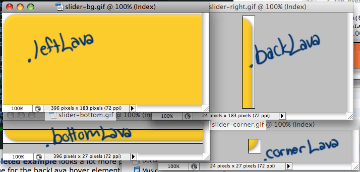 Here is a snapshot of four separate background images I have cooked up for the original LavaLamp demo. You should be able to see their dimensions, filenames and the classes they are assigned to within the .backLava element, namely .backLava, .leftLava, .cornerLava and .bottomLava. For your own production you want to make sure the .leftLava element is large enough to fit the largest possible area that you will be applying the LavaLamp hover effect.